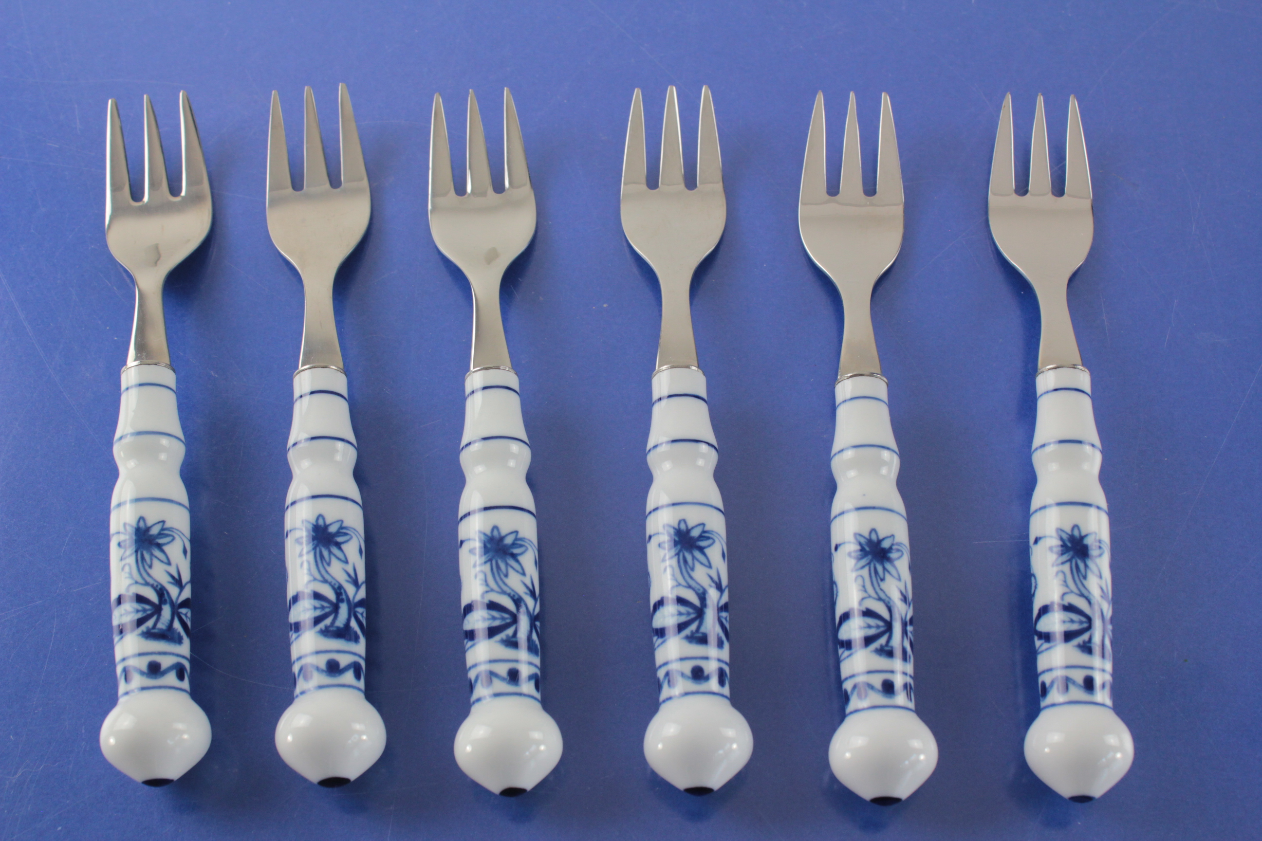 ABS DDR Zwiebelmuster 6 Kuchengabeln Porzellangriff 18/10
