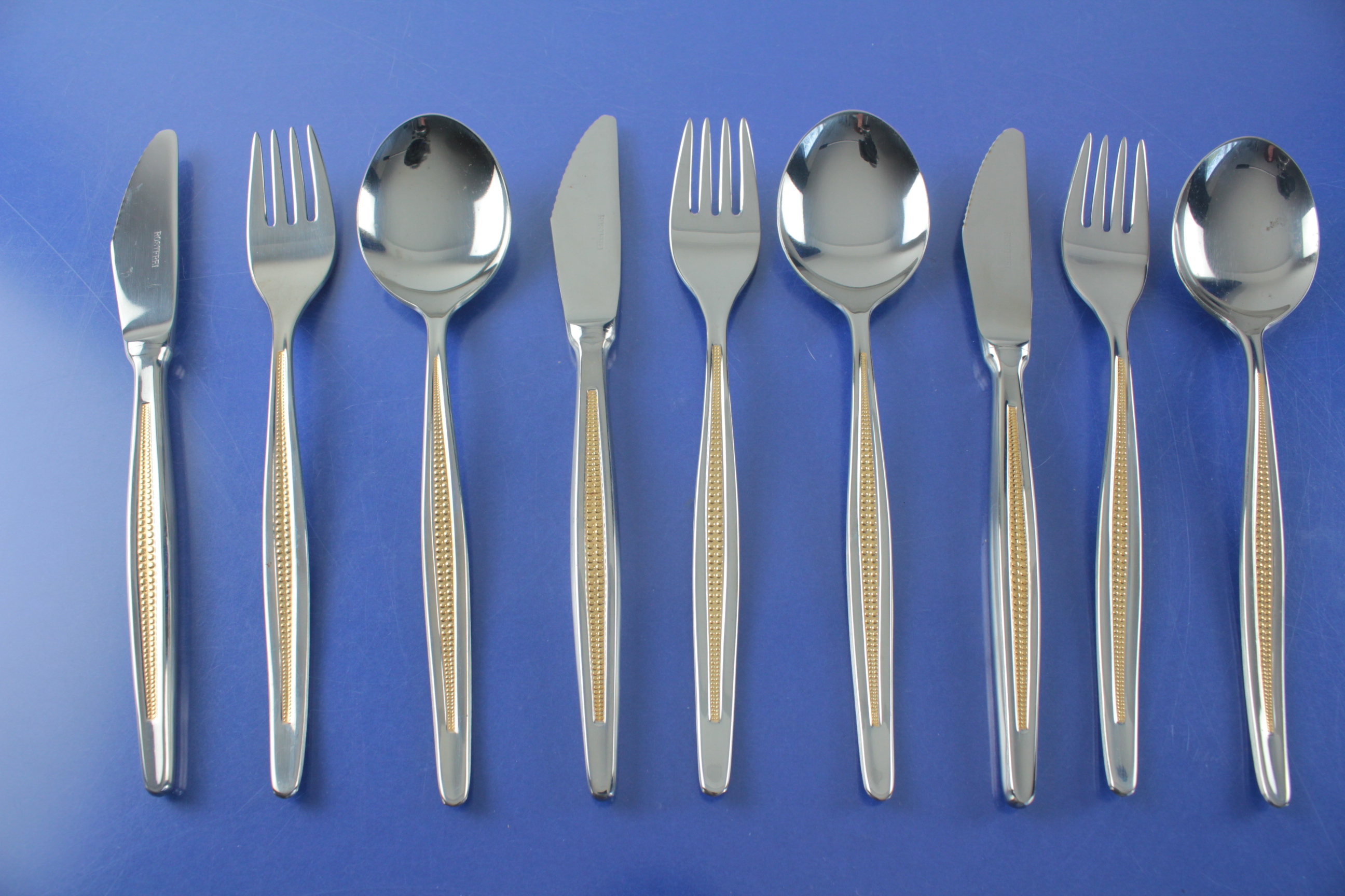 BMF Besteck Konvolut 9 Teile Dekor vergoldet Je drei Messer, Gabeln und Löffel Material: Edelstahl 18/8, Dekor vergoldet