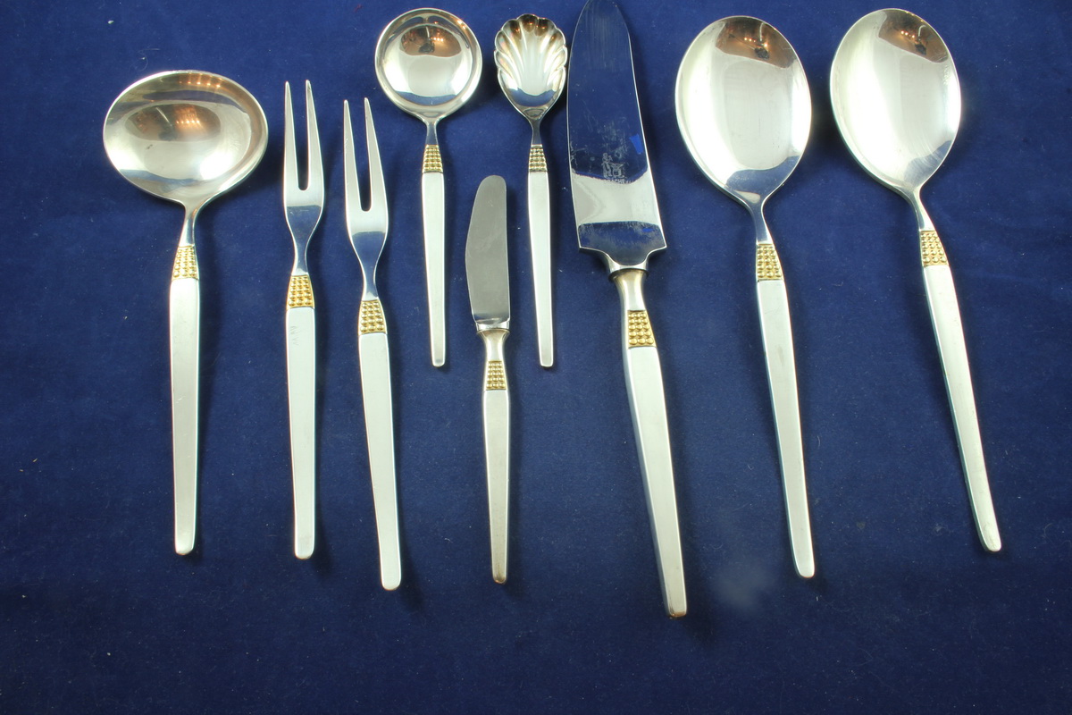 6 Tafelmesser, 6 Tafelgabeln, 6 Tafellöffel, 1 Tortenmesser, 1 Obstmesser, 1 Sahnelöffel, 1 Zuckerlöffel, 2 Fleischgabeln, 1 Saucenkelle, 2 Gemüselöffel