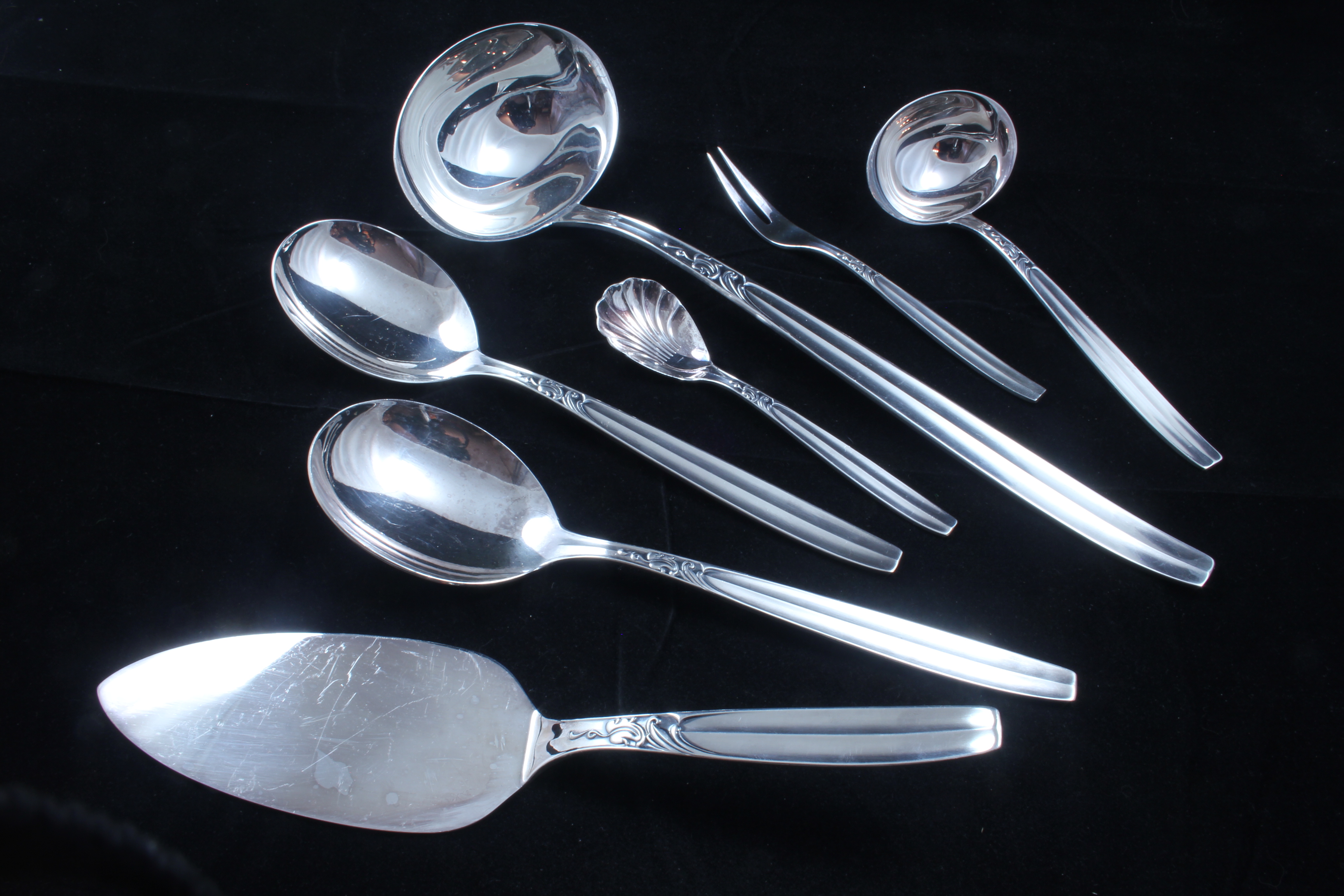 6 Tafelmesser, 6 Tafelgabeln, 6 Tafellöffel, 6 Kuchengabeln, 6 Kaffeelöffel, 1 Suppenkelle, 1 Saucenkelle, 2 Servierlöffel, 1 Fleischgabel, 1Tortenheber, 1 Zuckerlöffel