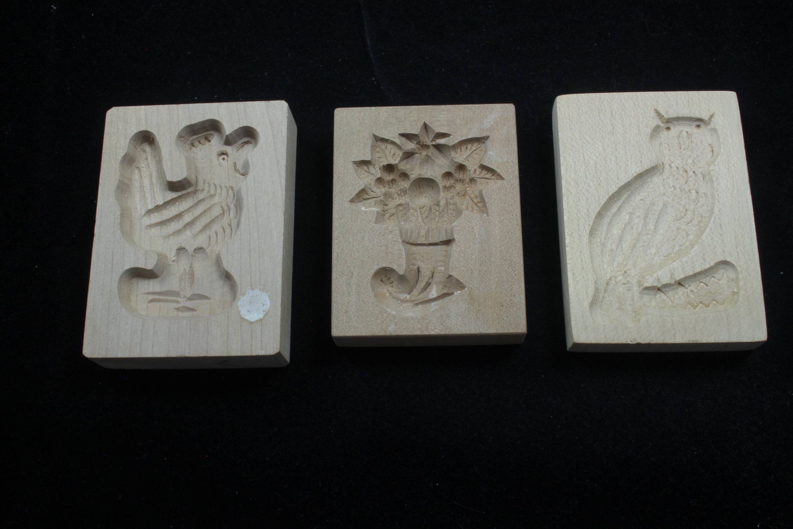 3 x kleine Spekulatiusform Spekulatiusmodel Motive "Vogel" "Eule" "Pflanze"