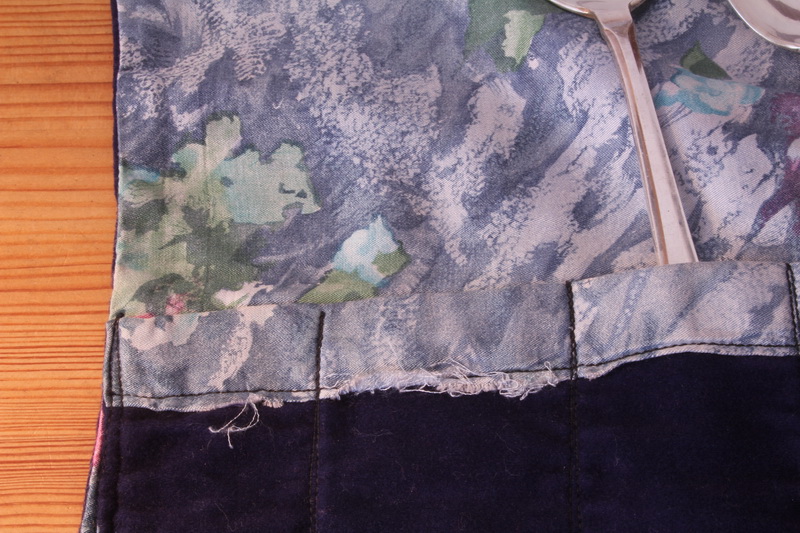 blauer Samtstoff, innen mit geblümtem Stoff gefüttert